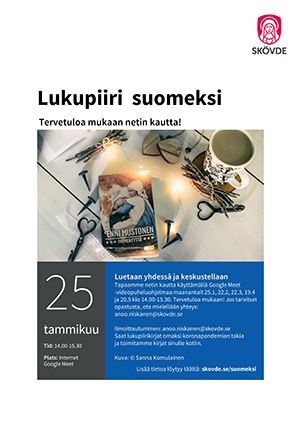 Skövden lukupiiri. Luetaan yhdessä ja keskustellaan Tapaamme netin kautta käyttämällä Google Meet -videopuheluohjelmaa kevään 2021 maanantait 25.1, 22.2, 22.3, 19.4 ja 20.5 klo 14.00-15.30. Tervetuloa mukaan! Jos tarvitset opastusta, ota mielellään yhteys: anoo.niskanen@skovde.se