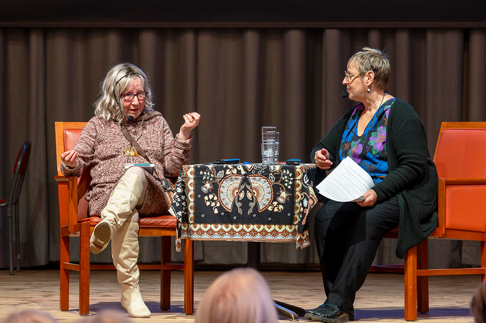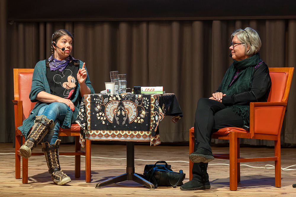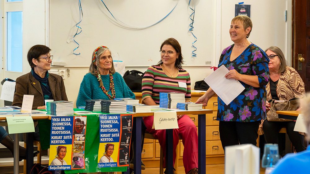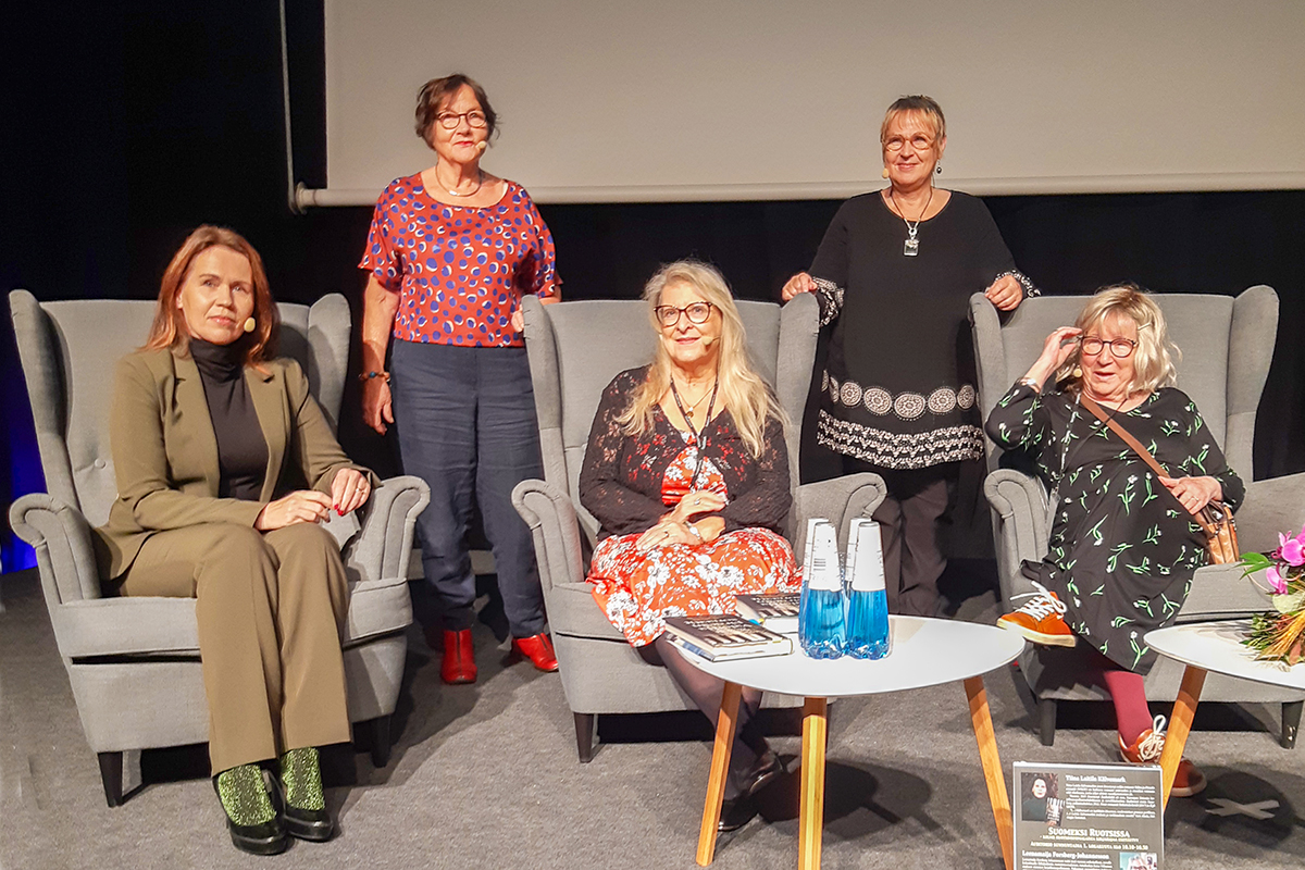 Turun kirjamessujen 2023 ruotsinsuomalaiset esiintyjät, istumassa vasemmalta Tiina Laitila Kälvemark, Pirjo Marjut Vega-Brandt ja Leenamaija Forsberg-Johannesson. Takana haastattelijat Leena Häyrynen ja Maarit Turtiainen. Kuva: Ari Setälä